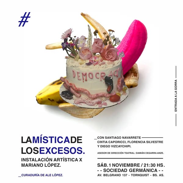 “La mística de los excesos” también habla de cultura popular, de banquetes visuales y sonoros, de un humor que se burla del poder con la misma fuerza con que lo expone. Hay flores sobre una torta que dice democracia, hay bananas pintadas de rosa, hay sarcasmo, hay ritual. Y en medio de esa orgía de signos, lo que queda es una certeza: el exceso, más que una desmesura, es un método para entender la época.